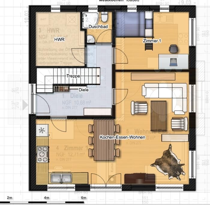 Zuerst haben wir versucht, den Koch-Ess-Wohnbereich in der ursprünglichen Aufteilung (Kochen im Osten) etwas größer zu gestalten, indem wir bei Flur, Hauswirtschaftsraum und Gästebad etwas Raum abgeknapst haben.