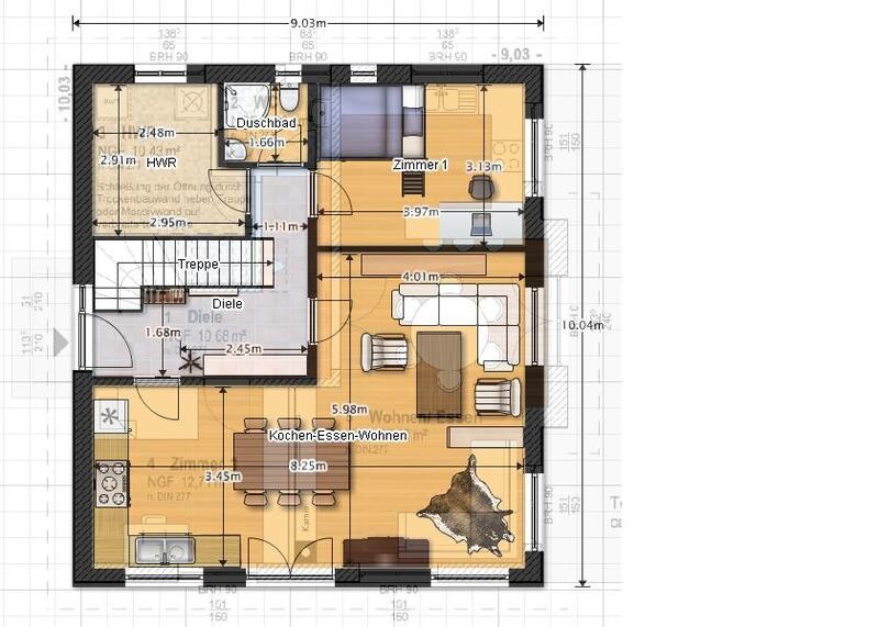 Im OG soll es hoffentlich, sofern bezahlbar, einen Zwerchgiebel geben. Im ersten Entwurf war auch noch ein Giebel an der Südseite ganz durchgezogen. Man sieht das in den Grundrissbildern noch im Hintergrund durchschimmern. Vollständige Bilder der ersten Entwurfs in Post 12. Ich finde aber, der Giebel macht die Raumaufteilung im EG eher unflexibler, weil man dann nicht so leicht Möbel neu anordnen kann, was wir wahrscheinlich je nach Nutzungssituation viel tun werden.