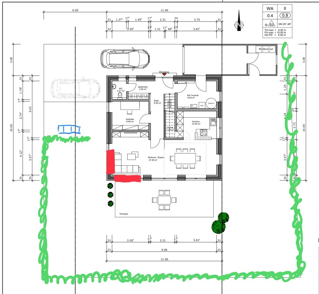 Ich habe noch schnell quick & dirty eingezeichnet, wie wir uns aktuell die Hecke (grün), Mülltonnen (blau) und Fenster im Wohnbereich (rot) vorstellen. Bei den Fenstern wollen wir es wie gesagt bodentief und ca die Breite von 2-2,5m. Richtung Westen Sichtschutz durch Hecke und Süden ist der Garten.