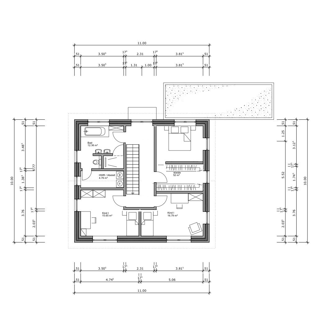 Die Treppe würde auf die andere Seite wandern, was wiederum praktisch wäre, weil du dann im OG einen Zugang durch die Ankleide realisieren kannst. Kind nen Tick kleiner, dann bekommst du auch noch eine zweite Schrankreihe rein und kannst ein Fenster in die Ankleide setzen.