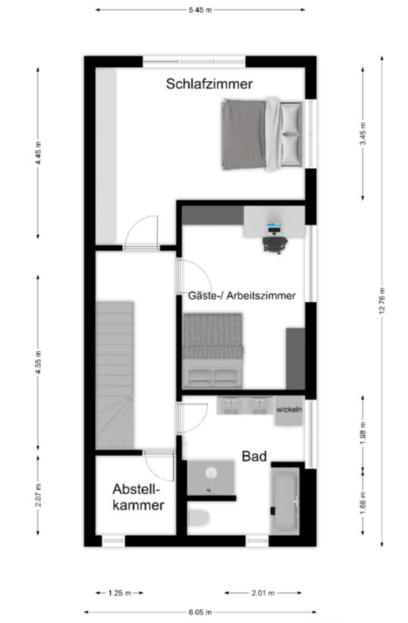 Grundriss eines Stockwerks mit Schlafzimmer, Gäste-/Arbeitszimmer, Bad und Abstellkammer.