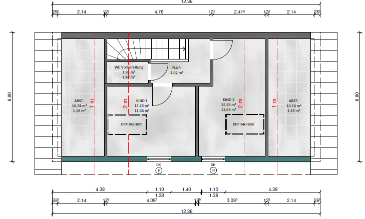 Die Tür von Kind 1 andersherum anzuschlagen, sehe ich auch so, und die von Kind 2 würde ich so weit versetzen, daß dahinter eine Schranktiefe bleibt. In Abstellraum und Bad halte ich 76er Türen für ausreichend, aber auch 88.5er Türen nicht für zu üppig; in den Schlafräumen nähme ich 88.5er. Den seitlichen Dachüberstand würde ich so wählen, daß das Gesamt-Doppelhaus dadurch nicht "schief" aussieht. Die Fassadengliederung finde ich so tolerabel vom Optimum abweichend, wie es in dieser Hausform und -größe oft nicht perfekter geht. Kennt man inzwischen die Planungen "der anderen Hälfte" ?