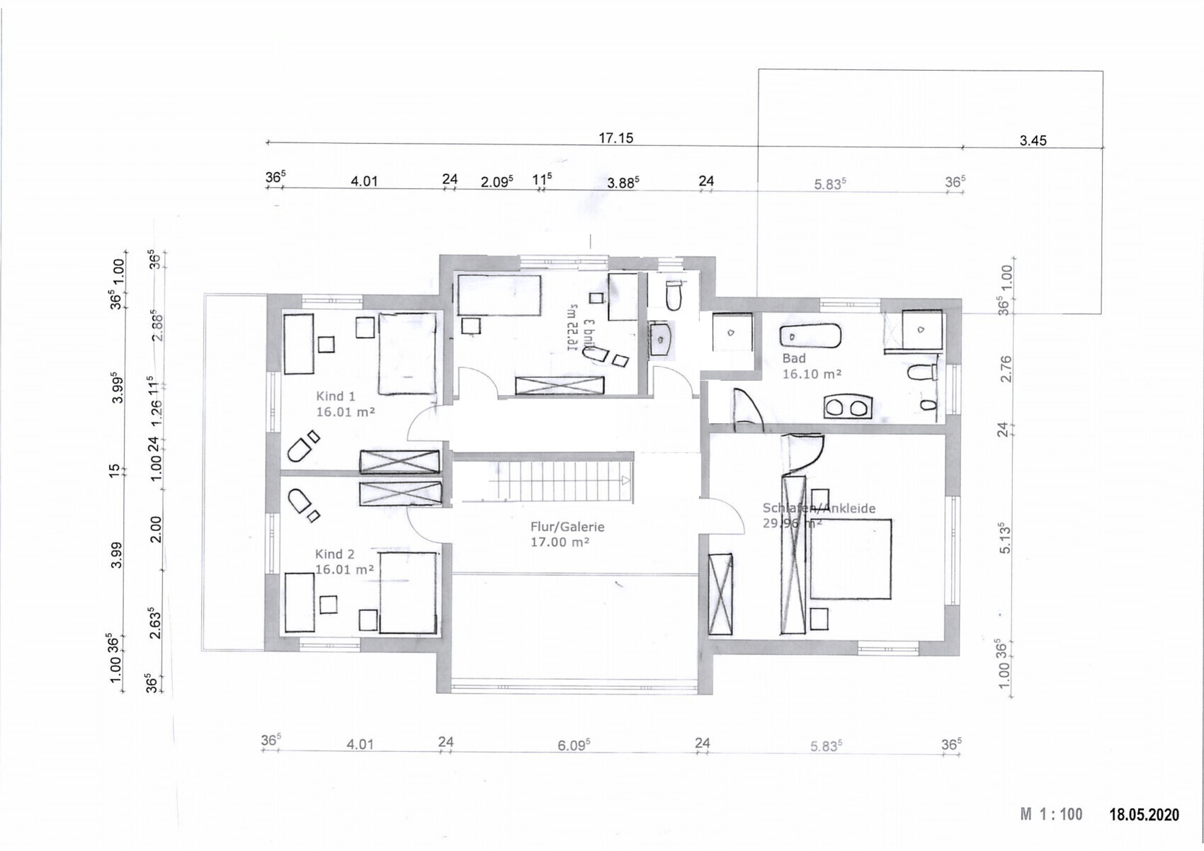 Daher ginge mein Vorschlag in die Richtung (ohne Maße berücksichtigt zu haben, also ob der Treppenausschnitt für Podest reicht, ob das Kinderzimmer 3 dann die gleiche Größe hat etc.):
