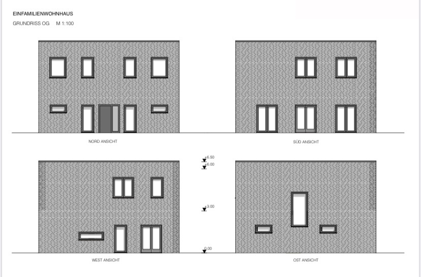 Das sind die ersten Zeichnungen + Außenansichten, über das Dach etc. haben wir noch nicht gesprochen.