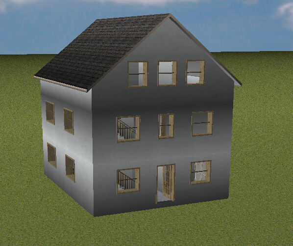 Zweistöckiges graues Haus mit vielen Fenstern auf grünem Rasen unter blauem Himmel