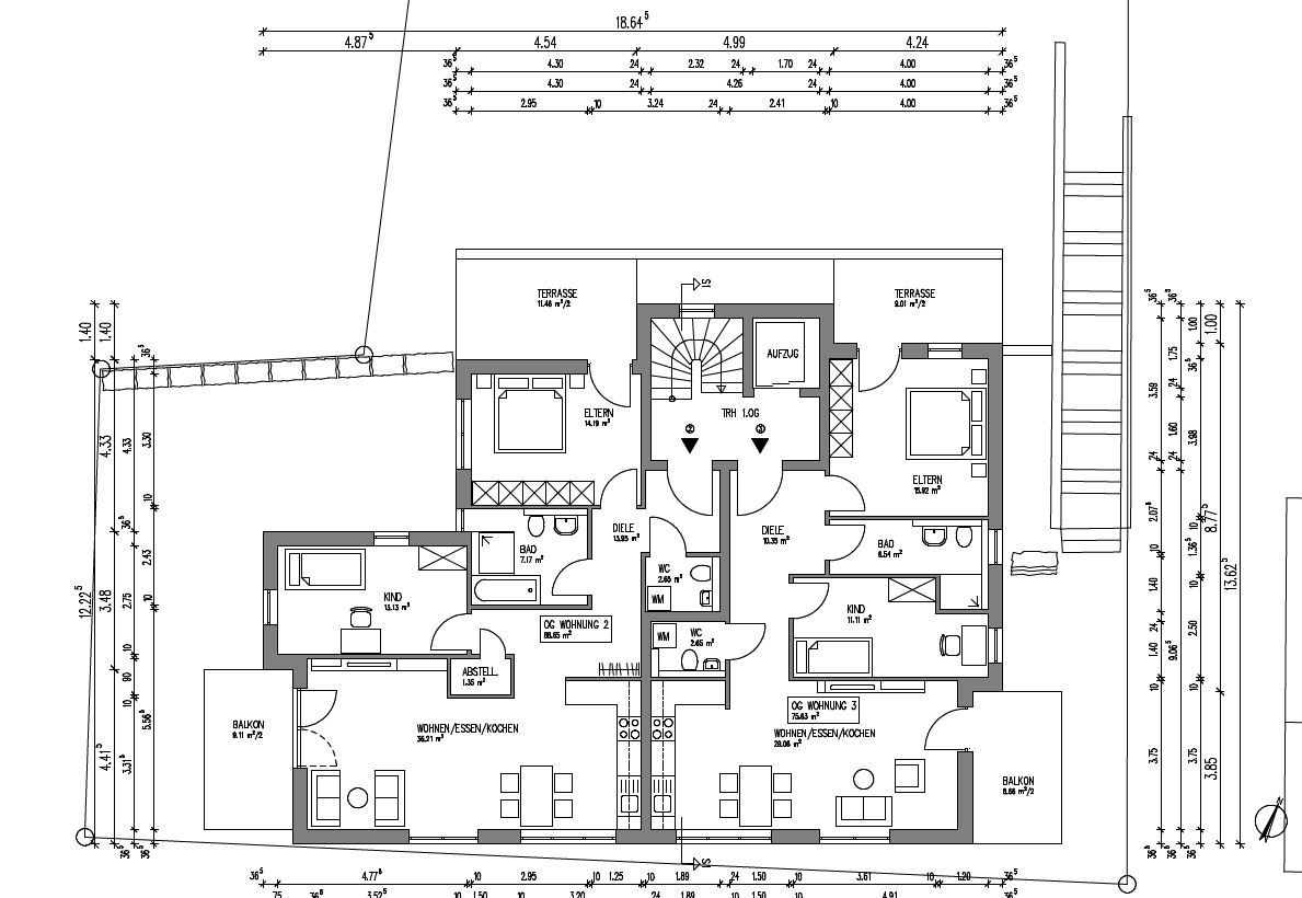 Ziehst du mal die Balkonflächen ab, hat Wohnung 2 noch 78m2, Wohnung 3 nur noch 66m2, da würde ich eine 2-Zimmer Wohnung bei heutigen Ansprüchen für vernünftiger halten.
