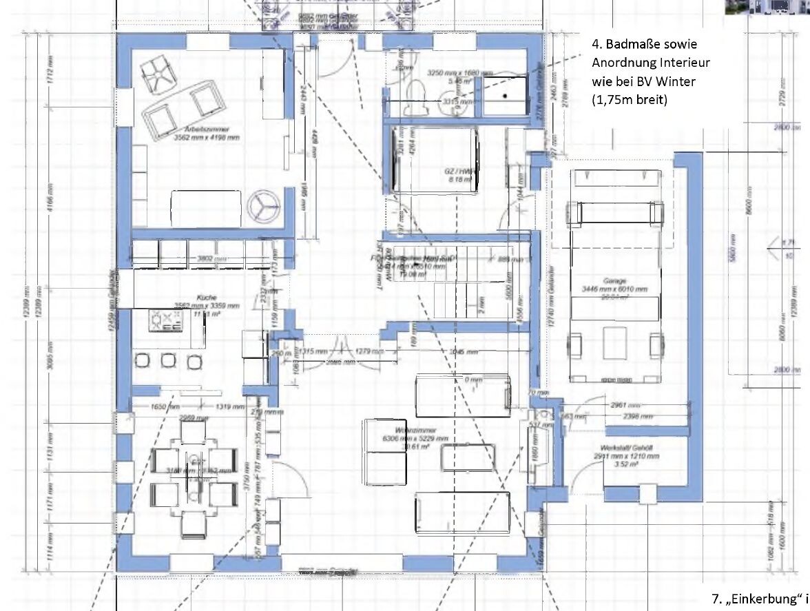Sollte 5,2 tief sein. Werden wir noch etwas verlängern.Blödsinn. Da muß das Tor trotzdem offen sein, um hinter dem Wagen herum zu gehen. Weg mit der dämlichen Zwischentür, dann kann auch das Gästezimmer bleiben.ypg schrieb: