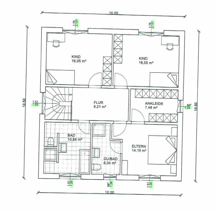 Die Kinder kriegen aber zum Osten und Westen hin noch Fenster. Welche Fenstermaße würdest Du wählen?kommt natürlich auch auf das EG an, muss ja zusammenpassen. Würde z.B. statt der 1,51m Breite lieber 1,76m nehmen, wir hatten im ersten Haus ein 1,51m breites doppelflügeliges Fenster, da ist die Glasfläche nicht besonders groß. Unter 1m Breite würde ich gar nicht gehen, auch nicht im Kinderbad. Bei euren bodentiefen Fenstern müsst ihr darauf achten, dass wirklich das fertige Maß angegeben ist, nicht dass noch der Fußbodenaufbau abgerechnet werden muss.