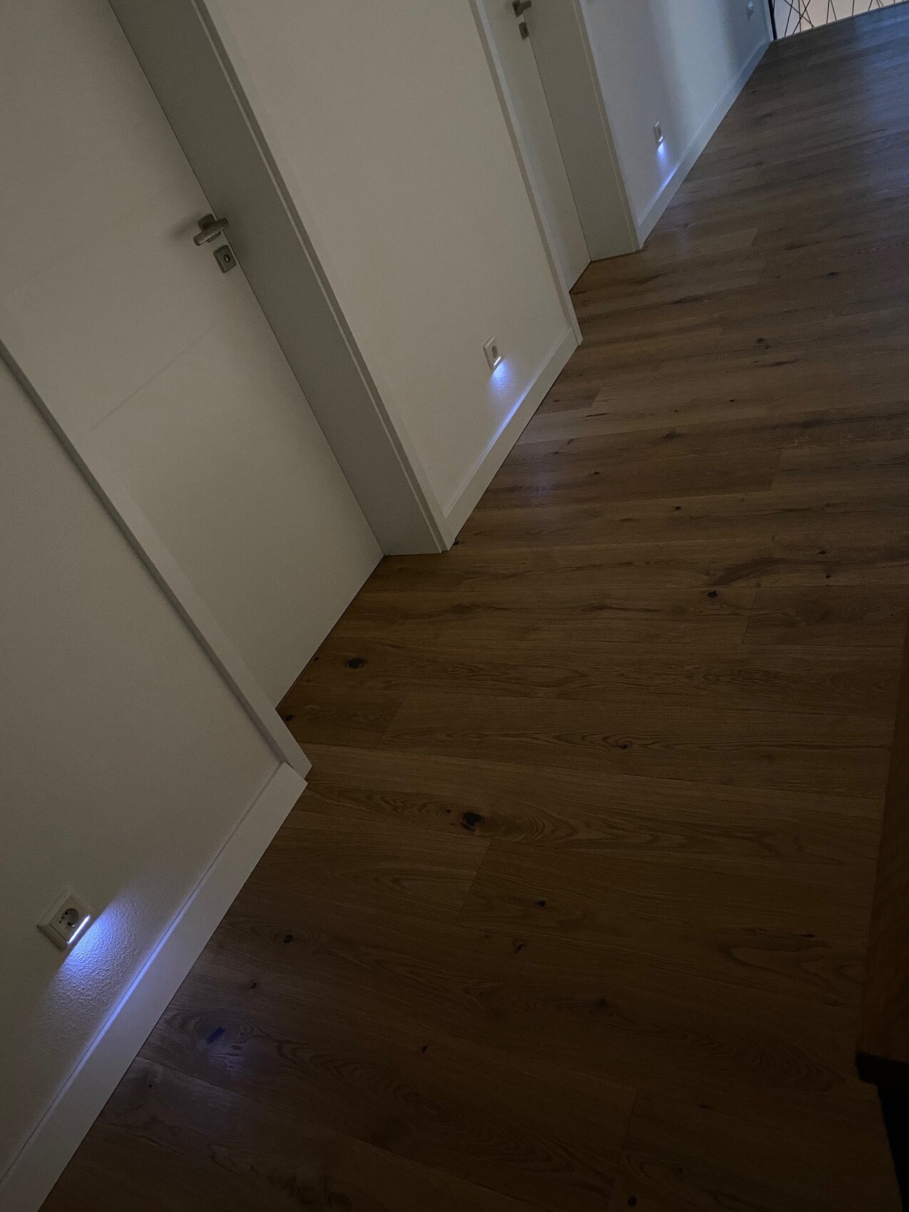 Da euer Flur relativ dunkel ist, würde ich Steckdosen mit Unterflurbeleuchtung installieren.Wo hast Du die denn her (und auch die schicken Türklinken und -beschläge) ?