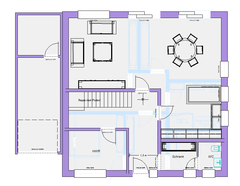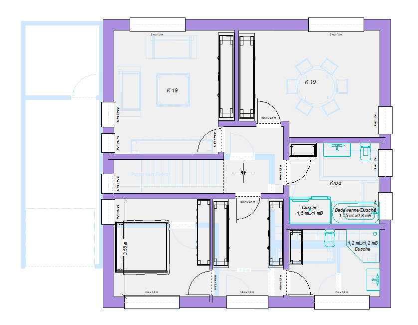 Ich kann dir leider nicht folgen oder ich steh auf dem Schlauch. Oder hast du einen Fehler gemacht? Ich Krieg das Elternbad nicht so groß hin wie du, da die Treppe stört. Es kann doch gar nicht so sein wie du es gezeichnet hast?