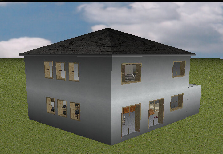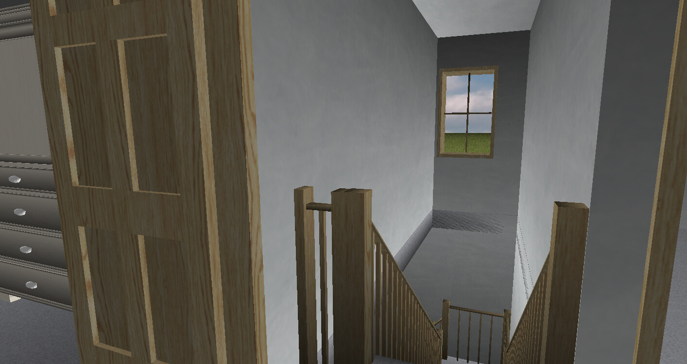 Hier noch ein Blick die Treppe runter, wobei die Darstellung eine Podesttreppe zeigt, weil mein Programm die andere nicht kann. Die Fenster- und Türrahmen haben alle ne schreckliche Farbe usw. aber für eine Vorstellung hilft es vielleicht?