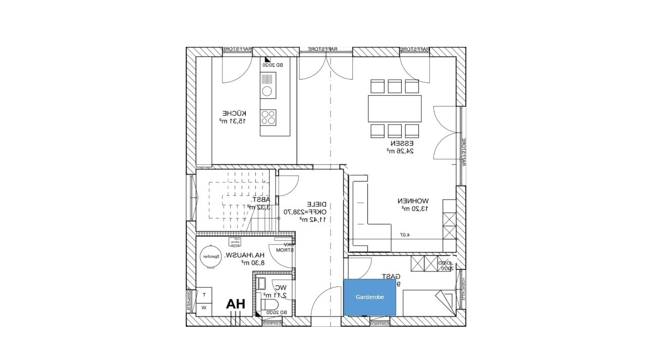 Grundriss eines Hauses mit Küche, Essen, Wohnen; blaue Garderobe markiert.