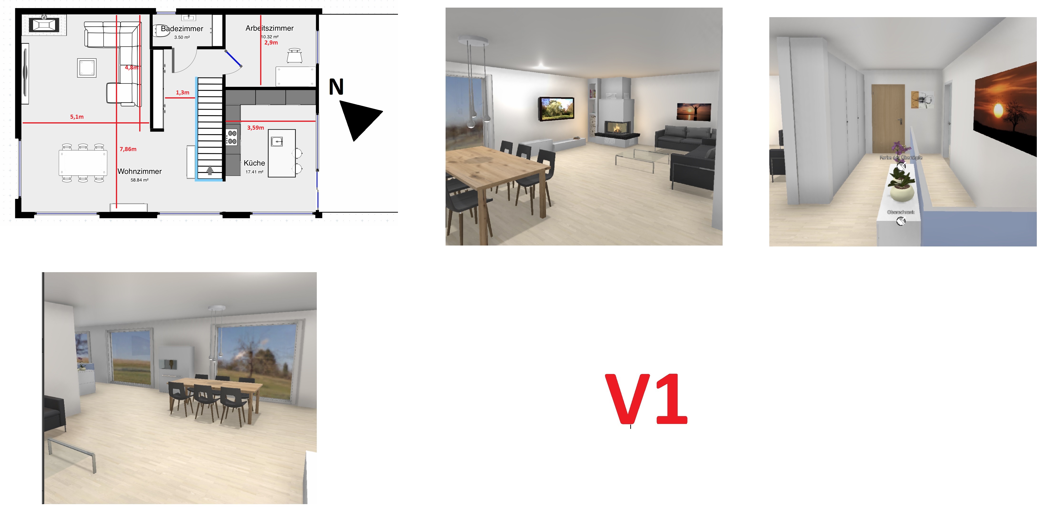 Bei V1 wäre mir der Esstisch viel zu weit von der Küche entfernt.