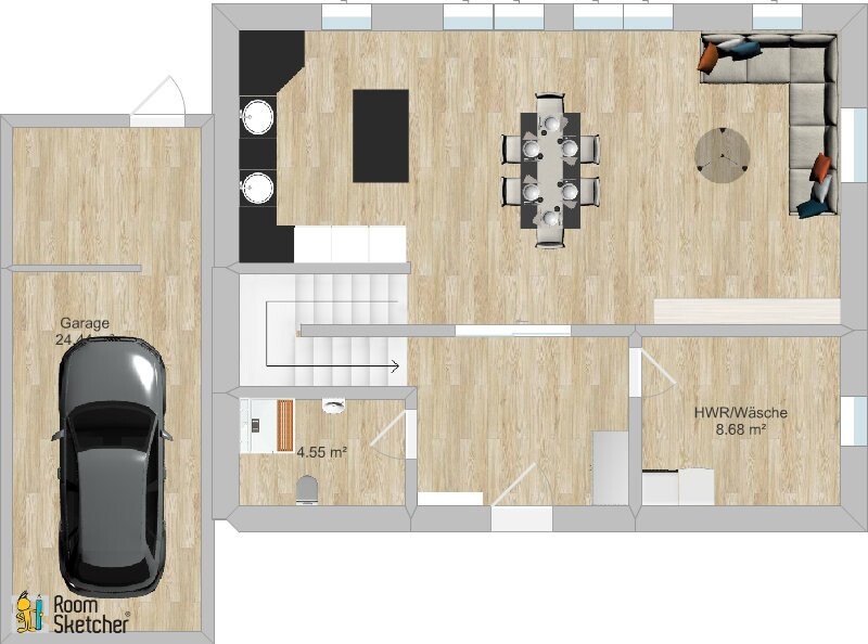 Aber vor allem finde ich, der TE sollte eine kurze Auszeit nehmen, um Grundlegendes reifen zu lassen. Damit meine ich weniger, wo die Treppe ihren Antritt hat, sondern: daß die Sitzecke und die Küche noch quer durch den Grundriss springend ihre Plätze wechseln, sollte sich vor dem Weiterplanen auspendeln.