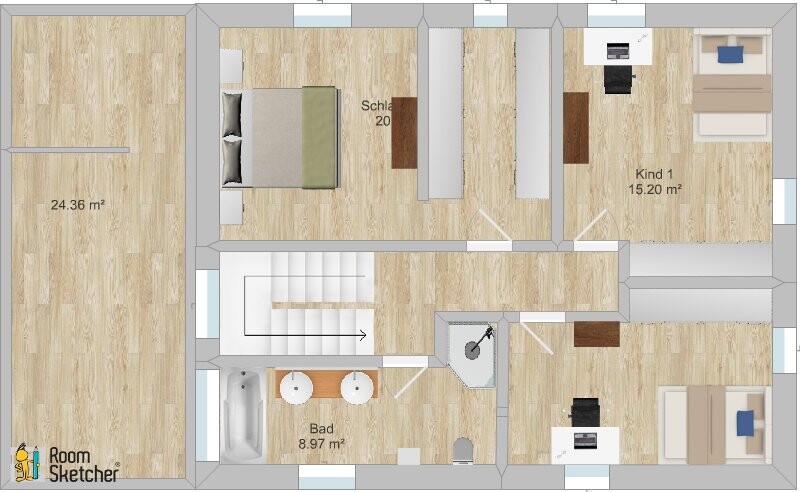 Auch oben nimmt es Gesicht an. Toilette ca. dort, wo auch unten Toilette ist (gleicher Abfluss minimiert Kosten), Waschtisch zw Tür und Fenster... im Bad ist Potential, wenn der Raum mind. 2,20 breit ist.