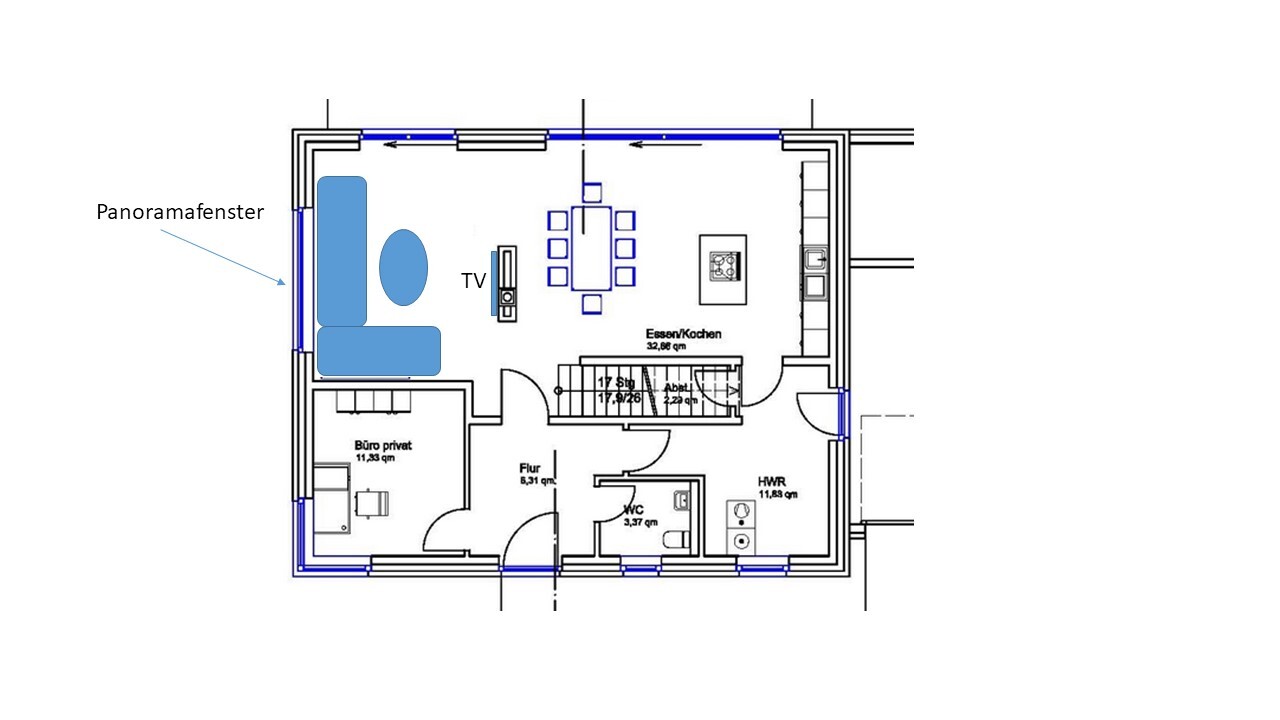 Wir hatten uns hier bewusst auf den Vorsprung vom Büro geeinigt, um dem Wohnzimmer noch etwas mehr Privatsphäre zu geben, wenn jemand den Wohn/Essbereich betritt. Man würde sonst hinein kommen und schaut natürlich direkt nach links auf das Sofa und mit dem Vorsprung ist dort ein kleiner Sichtschutz.Überlegt Euch mal definitiv, wo TV und Couch hinkommt. Und zeichnet mal Eure richtigen möbel ein, keine Platzhalter, die hier gar nicht hinpassen.Euer Denken ist insofern kontraproduktiv, da diejenigen, die dort sitzen würden, nicht sehen, wer von hinten kommt. Das bringt Unbehagen. Man sitzt nicht mit dem Rücken zur Tür. Wer von der Treppe nach unten geht, hat zur halben Seite einen Wandstummel vor sich, dann die Ecke, dann die Sofaseite. Das kann man machen, wenn dazwischen noch 2 Meter sind, aber nicht auf eng. Das ist nicht schön.