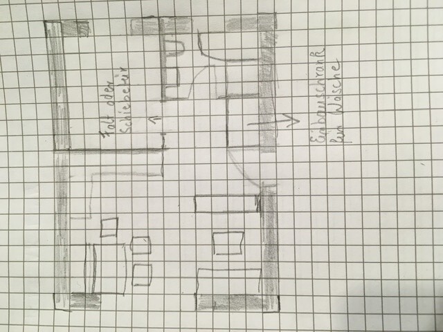 Handgezeichneter Grundriss einer Wohnung auf kariertem Papier: Räume, Türen, Möbel (Tische/Stühle).