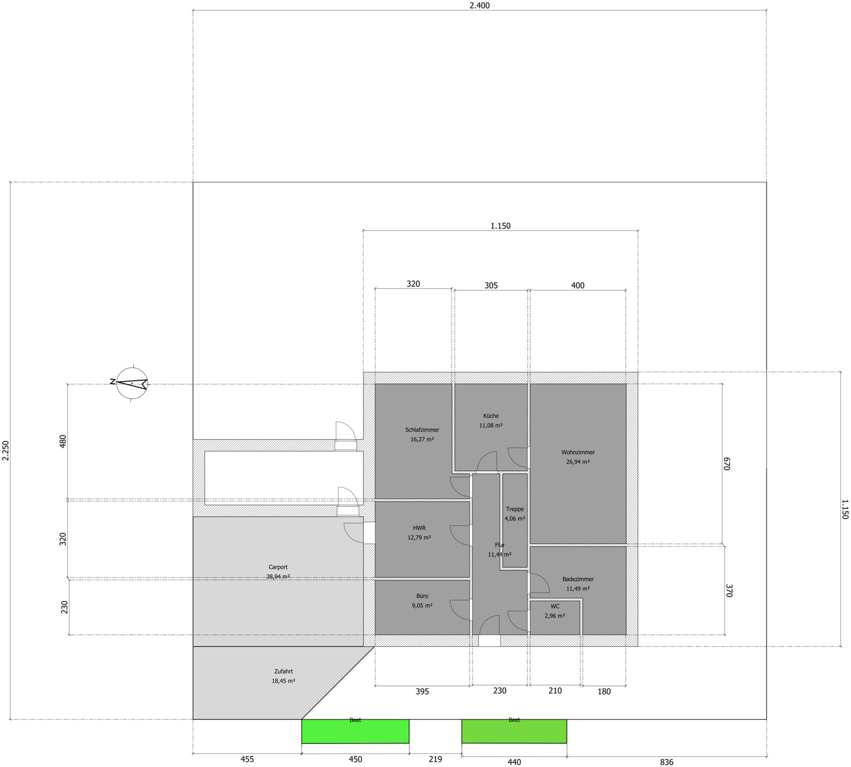Carport im Norden, Küche und Wohnzimmer über Eck Richtung Süd-Ost, Schlafzimmer im (Nord)-Osten, Hauswirtschaftsraum im Norden.