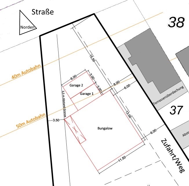 Hier der gewünschte Lageplan! Im Süden vom Haus verläuft eine Zufahrt die erhalten bleiben muss. Von der Westlichen Grenze müssen wir 3,5 m wegbleiben, da bei ca. 2,5 m ein Kanal verläuft.