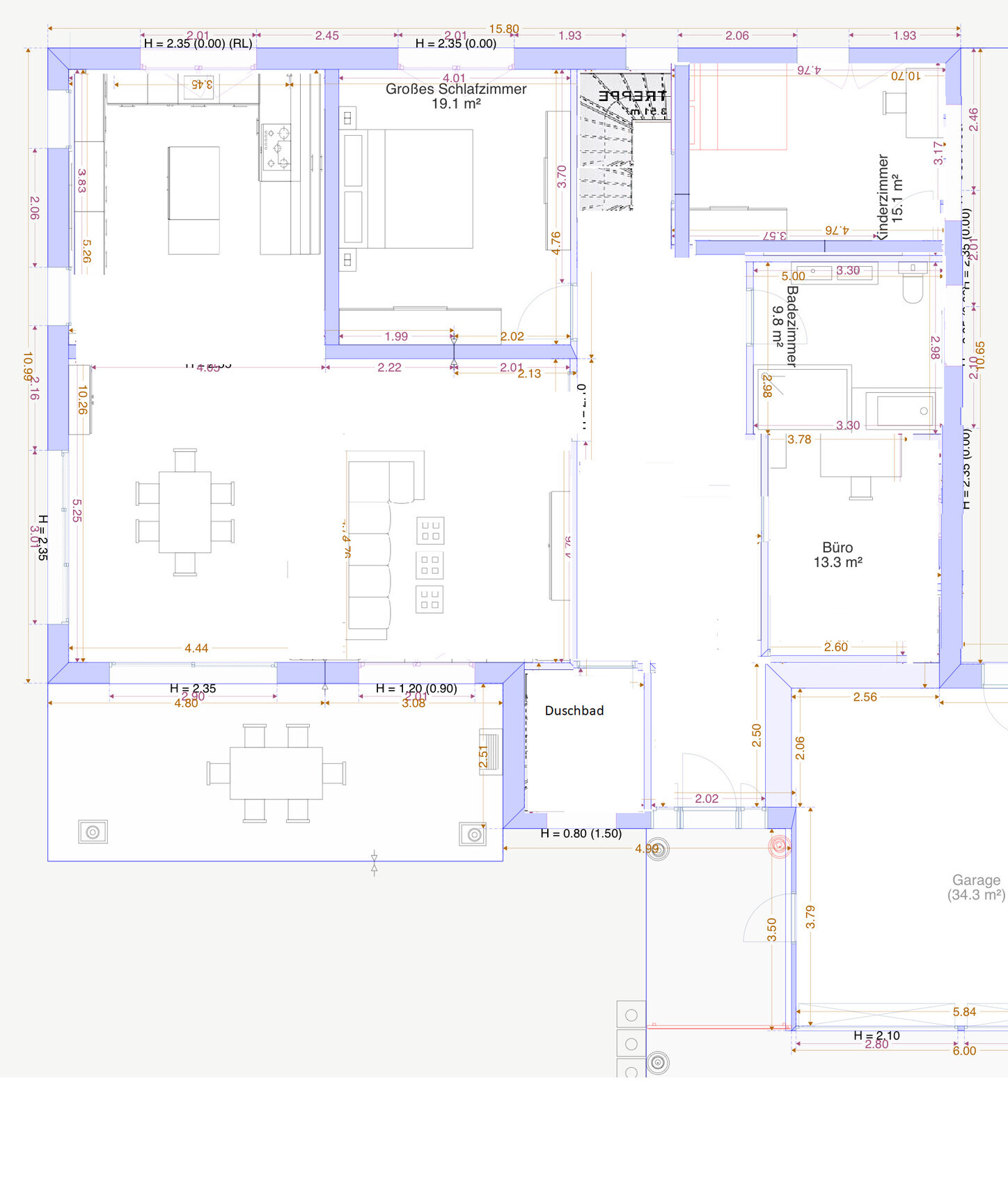 Grundsätzlich wäre auch zu überlegen, ob es 3 Duschbäder sein müssen oder das im Keller genügt und oben nur das kleine bad für das Geschäft genutzt wird.
