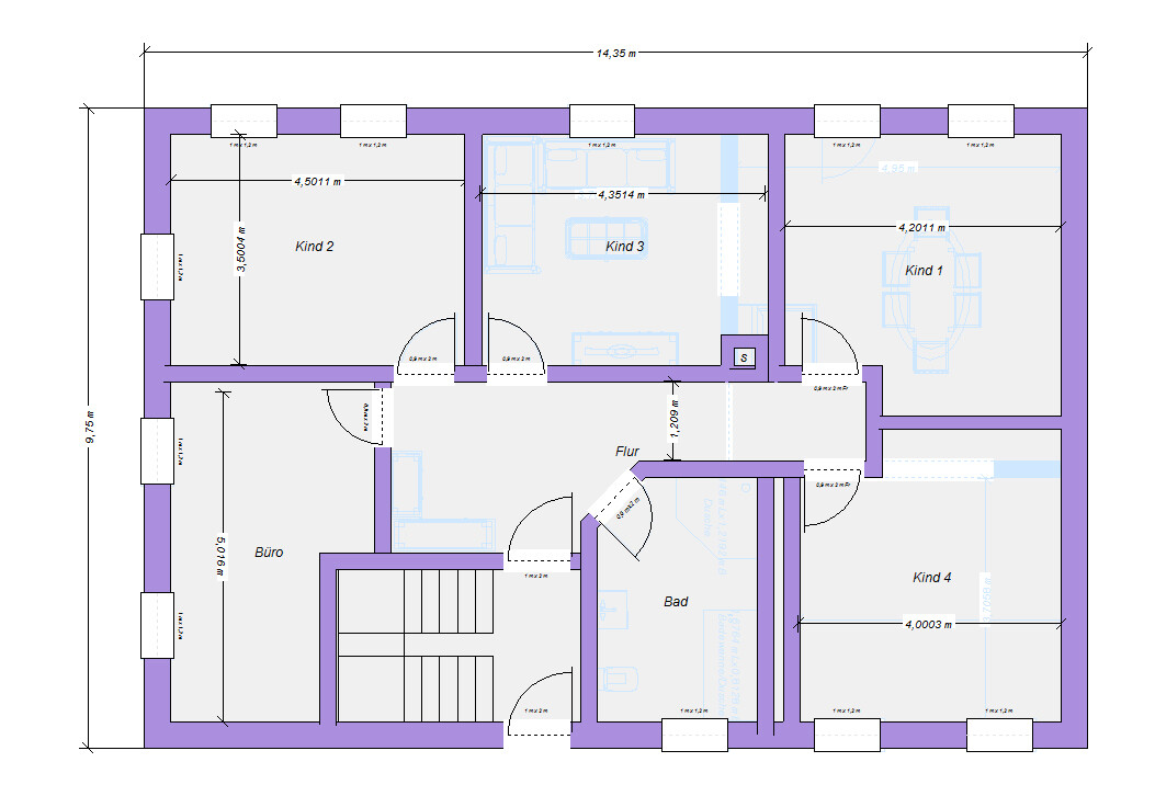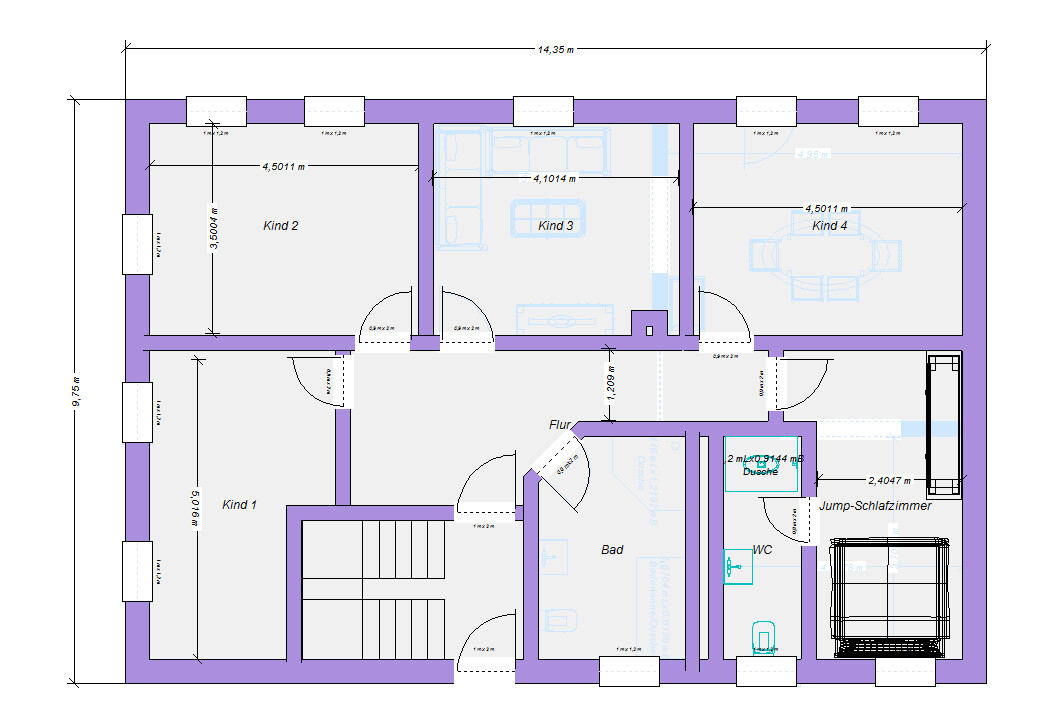 - Was gefällt besonders: Einfacher Grundriss, einfache Außenform. Gleichmäßige Raumaufteilung der Kinderzimmer, Balkonzugang für drei der vier Kinderzimmer