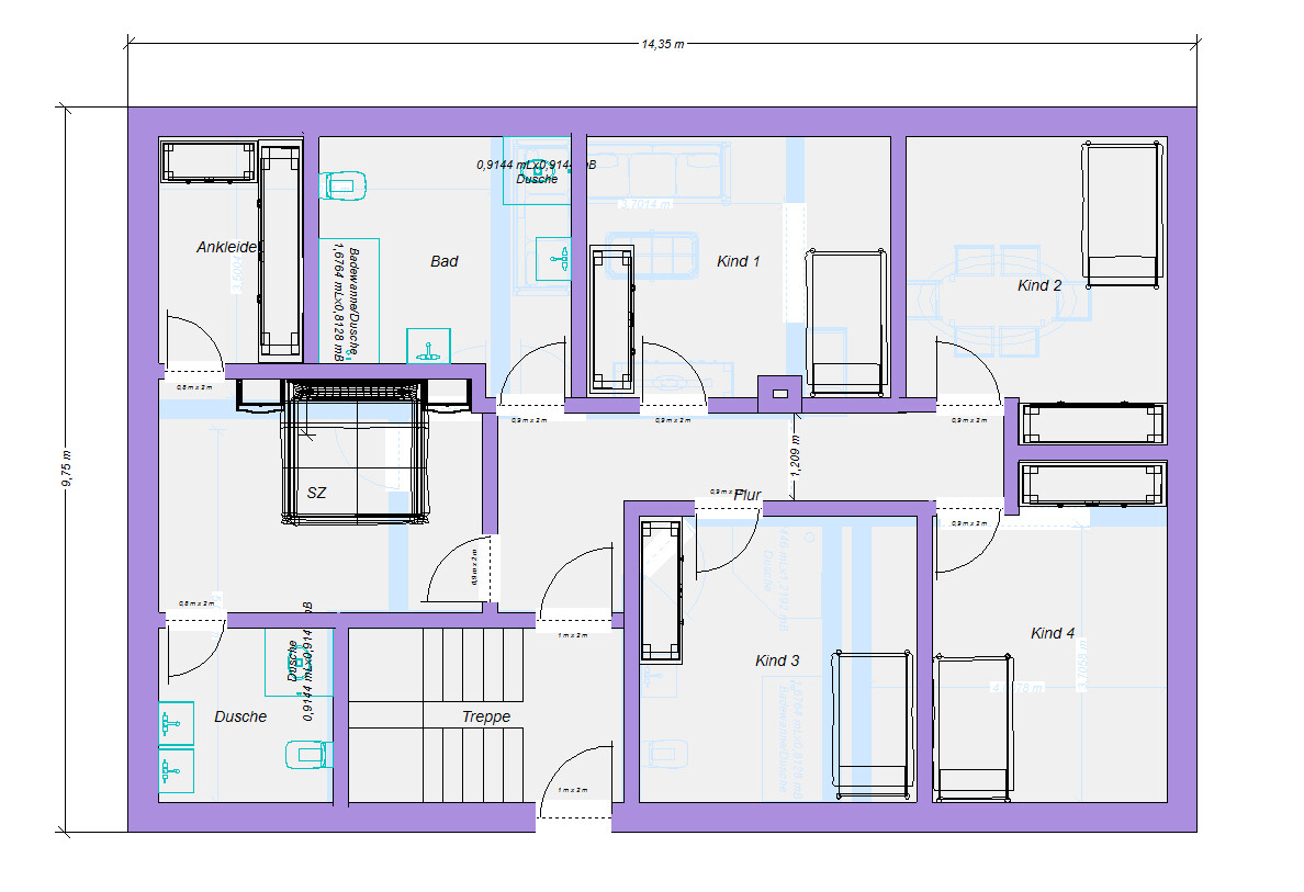 Auch wenn es nicht so aussieht, die Kinderzimmer sind alle annähernd gleich groß mit etwa 14m². Find ich für ein Kinderzimmer voll ok. Leider nur noch 2 mit Balkonanbindung. Schwerpunkt hier auf ein funktionierenden Elternbereich bei gleichbleibendem Ausgangs-EG.
