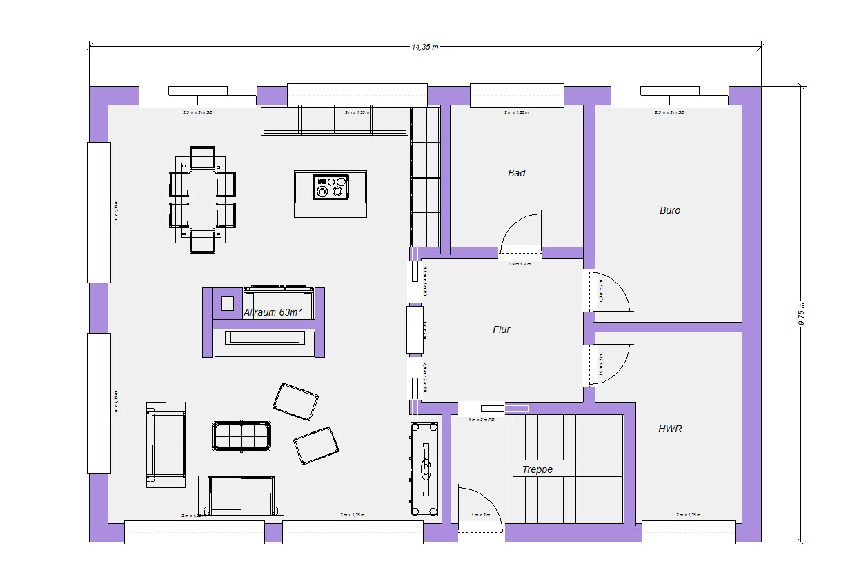 e) Gut denkbar ist für uns auch Ess und Wohnzimmer zu kombinieren und die Trennwände wegzulassen/rein optisch durch Regale oder den Kamin zu machen. Dann wirkt das auch größer.Ja, am besten man plant gleich einen großen Allraum, welcher m.E. viel besser an der zur anderen Hälfte abgewandten Seite des Hauses liegt. Auf die schnelle skizziert. Fenster nur beispielhaft, um die Beleuchtungsmöglichkeiten zu demonstrieren.
