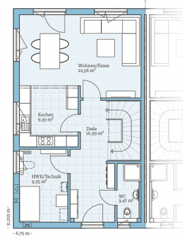 Grundriss eines Hauses mit Wohn-/Essbereich, Küche, Diele, HWR und WC.