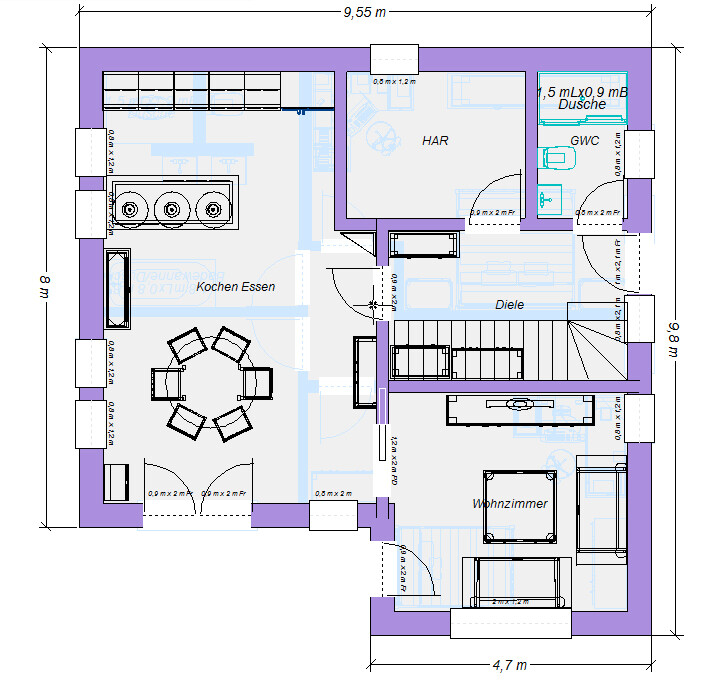 Ich kann meinen Vorschreiberinnen nur zustimmen. Und setze noch einen Punkt drauf ... 528 cm Rohbaumaß für Küche/Essen ist mehr als knapp