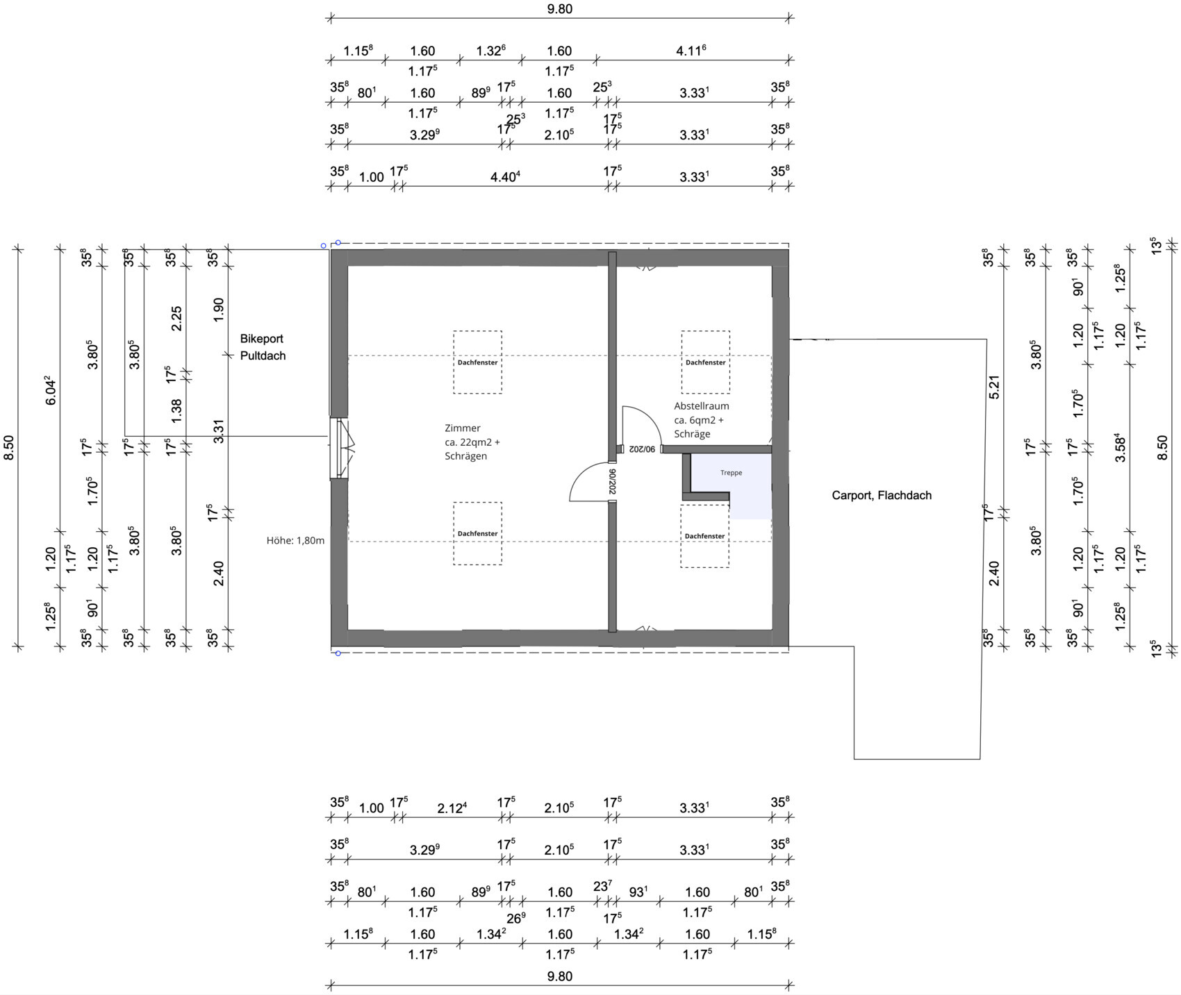 - Treppenauge bekomme ich meiner Meinung nach nur weg, wenn ich die halbgewedelte Treppe ins DG laufen lasse. Wenn ich das richtig berechnet habe würde das eine Kniestockerhöhung von 110cm bedeuten. Mit derviertelgewendeten Treppe funktioniert das DG schon vernuenftig mit 50cm Erhöhung. Wäre hier aus finanziellen Gründen wohl eher meine Präferenz