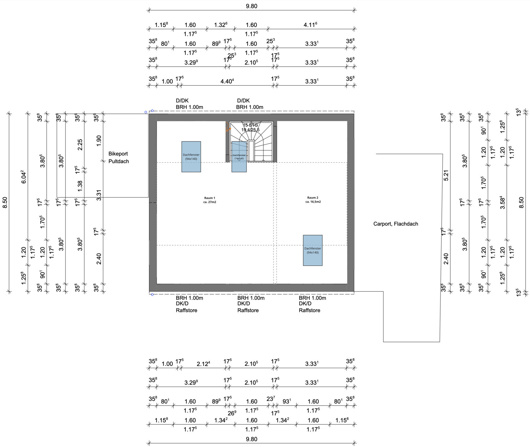 Die Lösung für ersteres ist die Anhebung der Dachneigung auf 40°, um im DG sinnvolle Räume erschließen zu können. Dabei kann die Treppe dann über der anderen sein.