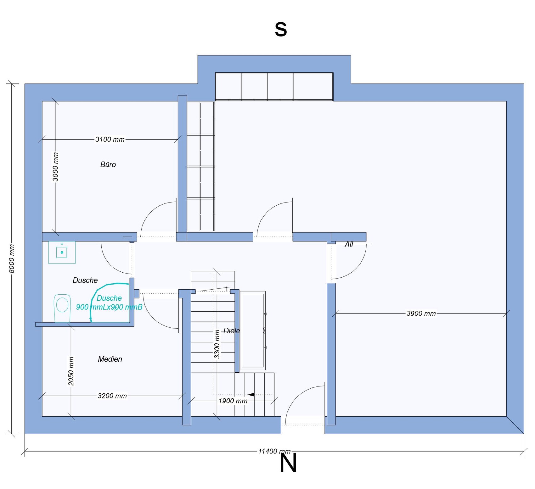 Bei einer Anstattvilla-Grundfläche würde ich mir noch´mal überlegen, ob da eine altbaunostalgische Raumhöhe wirken würde. Meine spontane Regung beim Anblick der schrägen Ecke im Schlafzimmer war "so´was redet einem ein Stempelaugust natürlich nicht aus", und dem Fragezeichen hinter der getreppten Wand im Wohnzimmer schließe ich mich an.Ich denke die fast Quadratform hat sich aus der Ausrichtung Ost-West mit dem Garten im Westen ergeben. Bei meinen Überlegungen komme ich bei einem schmaleren Haus mit der Aufteilung Küche, Flur, Hauswirtschaftsraum in der Breite nicht hin. Aber ich bin hier gern offen für einen anderen Vorschlag.