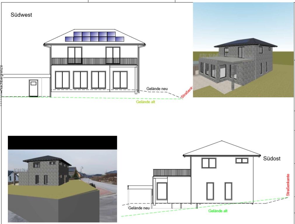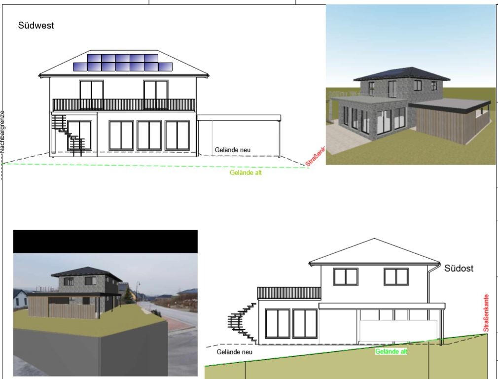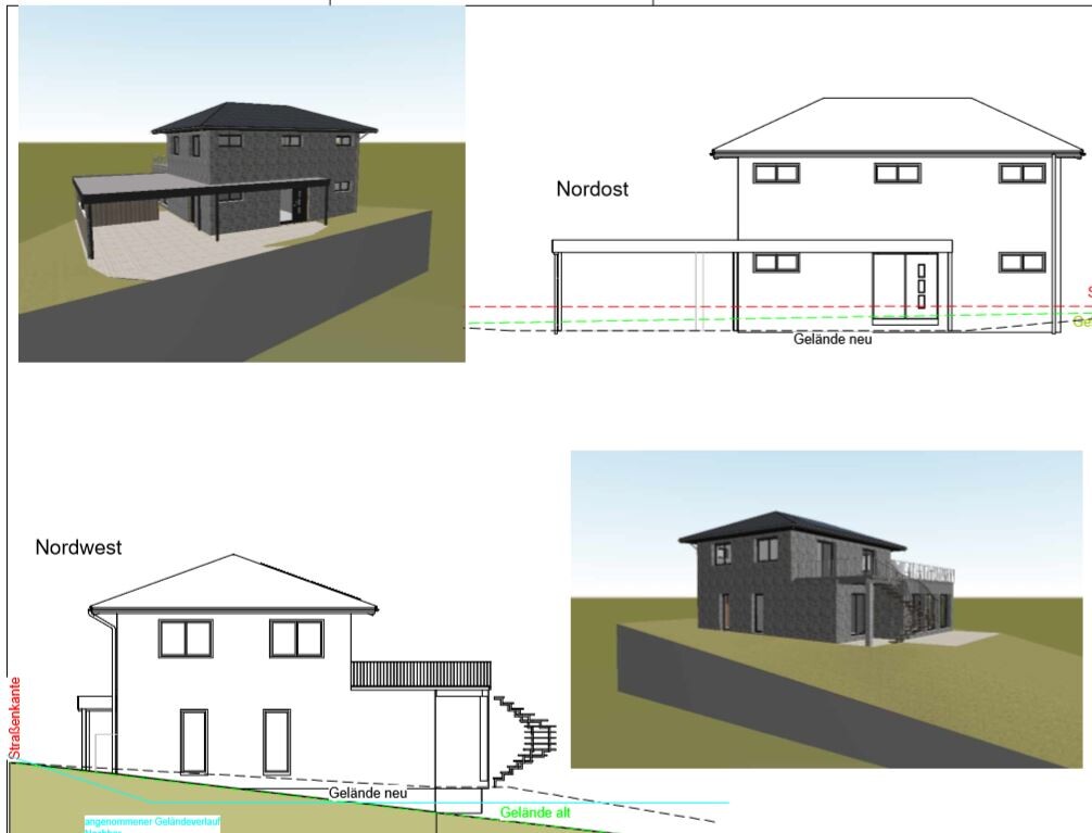 Auf mich wirkt dieser Entwurf, als habe jemand versucht, ein Raumprogramm und eine Wunschvorstellung von der "Skulptur" des Baukörpers als Hund und Katz´ zusammen in einen Sack zu sperren. An einer Ecke beißt dann sinnbildlich das Haus den Carport (oder der Carport kratzt das Haus).
