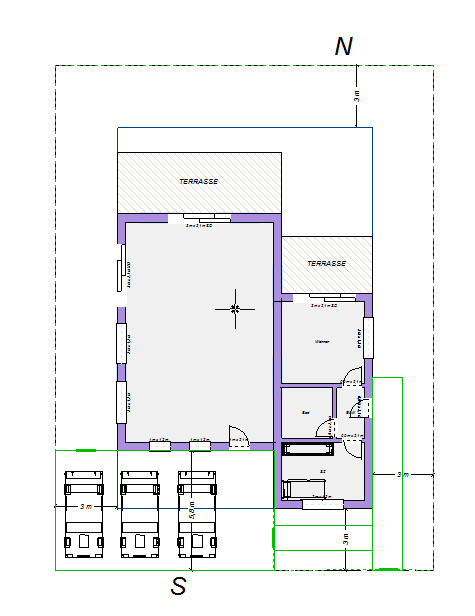 Es geht erstmal nur um die Aufteilung hinsichtlich Lageplan, Stellplätze, Terrassen und Wege. Ich würde in diese Richtung denken: