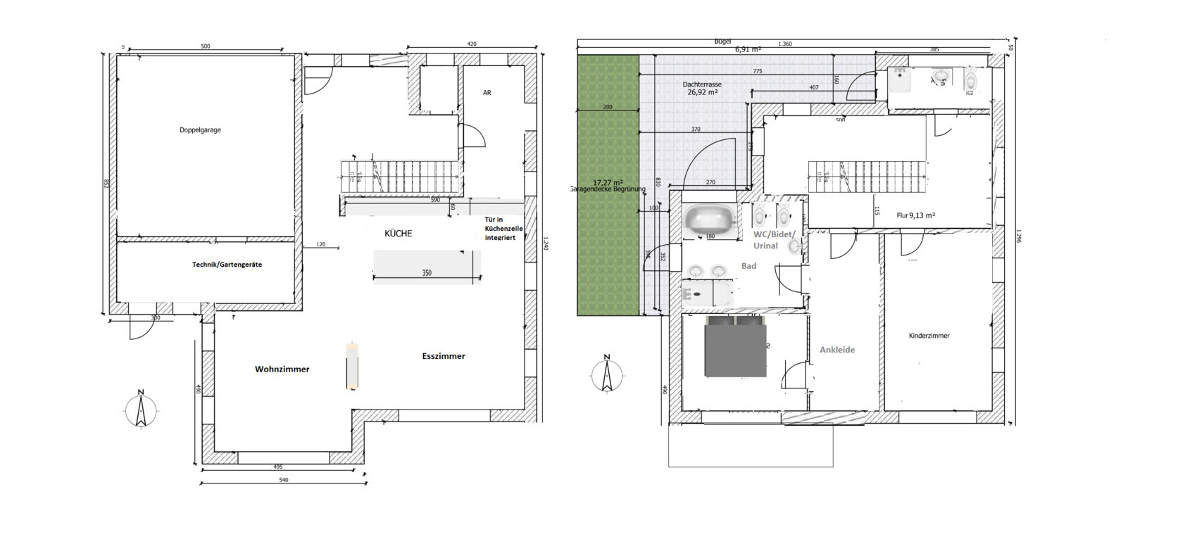 Dann dieser sinnlose Schlauch im Kinderzimmer, der nur deshalb existiert weil man das Kinderbad daneben geplant hat. Man sollte den Elternbereich von der Ankleide aus betreten, dann geht eine Tür ins Bad, die andere ins Schlafzimmer, so stört niemand den anderen.