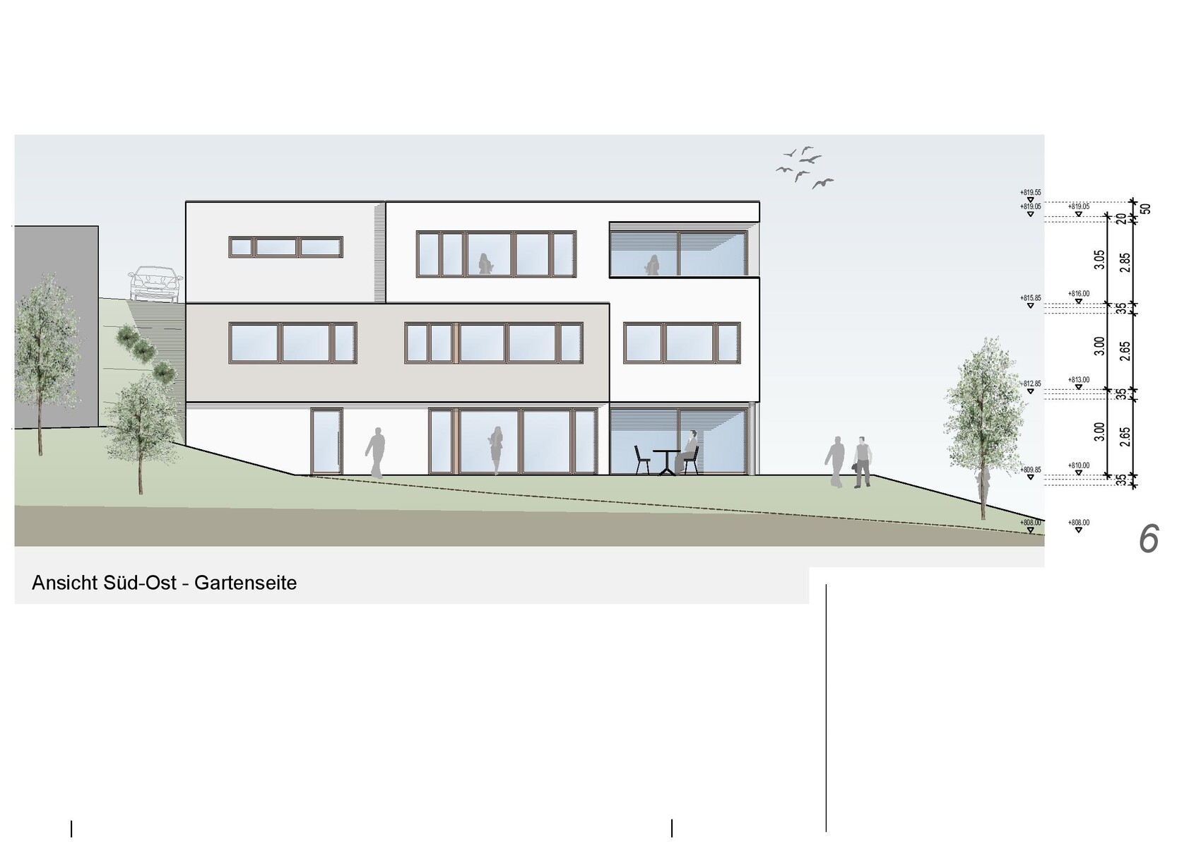 Was findest du besonders misslungen? Die Doppelflügel Fenster?Ehrlich gesagt die gesamte Bude. Sehen die Grundrisse noch klar (wenn auch verplant) aus, so wirkt die Kubatur des Gebäudes wie ein wild ineinander verschränktes Ensemble von Schuhkartons. Insgesamt scheint sich das Gebäude nicht entscheiden zu können, ob es den Hang nun längs oder quer kreuzen soll. Die Fenster leiden sicher auch an der "Baukasten-"kombination, d.h. daß die dreiflügeligen wie anderthalb zweiflügelige aussehen. Relative Bodentiefe, d.h. Bodentiefe nur auf ein (in sich dann allerdings nicht auf eine Terrasse mündendes) Geschoss bezogen, würde dies eher verschlimmbessern. Im Zusammenspiel von Formaten, Anordnung und Komposition wirken die Fassaden SO und NO wie von einem Automaten in einem Takt mit Fenstern bestückt.Will das Haus Haus oder Skulptur sein oder kann es sich gar nicht zwischen beidem entscheiden ? - das wird hier nicht klar. Und weil mich die Art, wie das nicht klar ist, an einen anderen konkreten Entwurf hier erinnert, daher der Link zum anderen Beitrag.