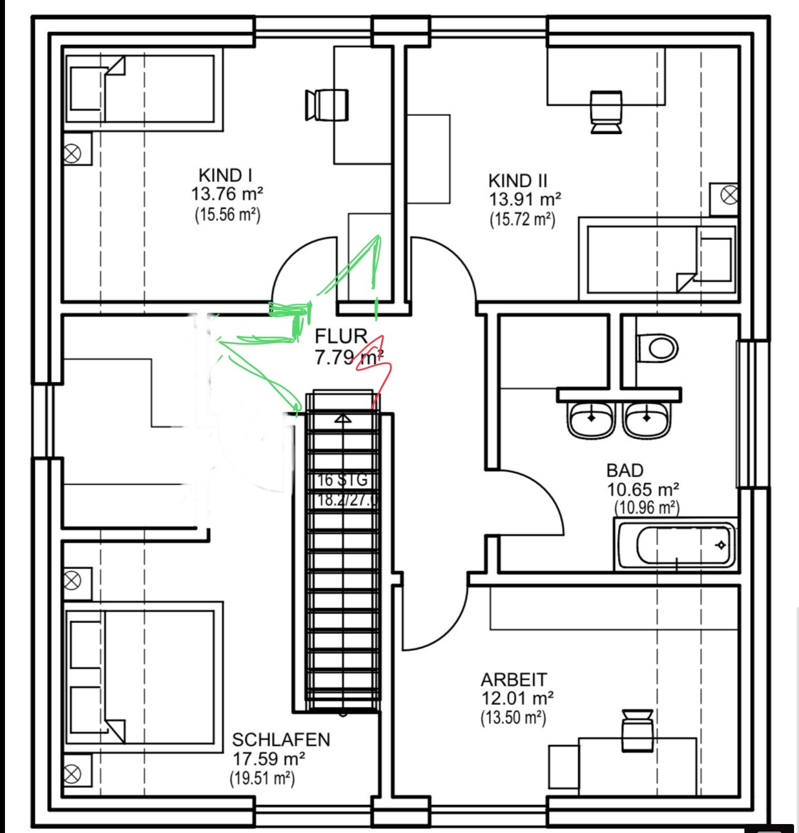 Mischung aus Standardentwürfen des GUs iVm unseren Wünschen (Zwerchgiebel + Erker)Das ist nämlich vermutlich genau die Diagnose. Ich könnte mir sehr gut vorstellen, daß die Mehrheit der inspirationsbeteiligten Standardentwürfe in Reinform überzeugender getaugt hat als der zusammengerührte Wolpertinger (nur weil man ein Cabrio mit großer Heckklappe will). Blaubeereis mit Zartbittermayonnaise. Zu viel mehr als Durchfall können solche "Mischungen" nicht führen. Jeder Verbesserungsversuch erhöht die Zahl der Ecken und die Unzufriedenheit.Einläufige gerade Treppen sind schon bei einer Altstattvilla eine Hypothek für den Grundriss - hier kam dann wohl noch hinzu, daß es oben kein Vollgeschoss werden darf, daher die Dachausbeulungen.
