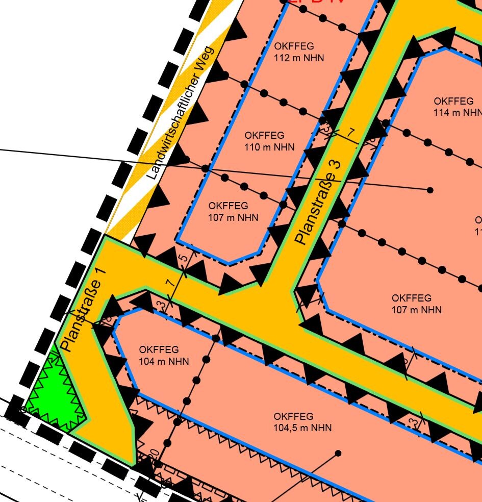 Sag mal, @Guido1980, wie stark ist der Hang denn jetzt genau im Baufeld? Vielleicht geht man auf Splitlevel oder setzt das Esszimmer etwas ab. Mir schwebt da so ein Gedanke im Kopf rum... Das Gefälle beträgt 3 m pro Grundstück (siehe auch beiliegenden Ausschnitt aus dem Bebauungsplan).