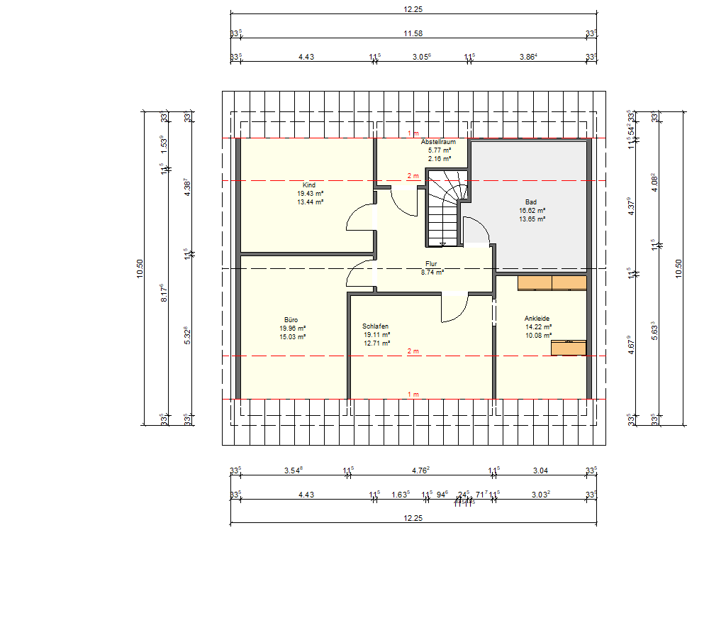 Wo ist denn da eine Verbesserung? Das Kind zieht in 4 Jahren aus, und dann hat man oben ein Schlafzimmer als Durchgangsraum, nur mit Dachflächenfenstern, wo das Bett noch nicht mal an der Wand stehen kann und der Abstellraum kaum begehbar ist. Logisch wäre hier eher, Schlafzimmer und Ankleide zu tauschen, damit das Schlafzimmer zumindest ein vernünftiges Fenster in vernünftiger Ost-Lage bekommt.