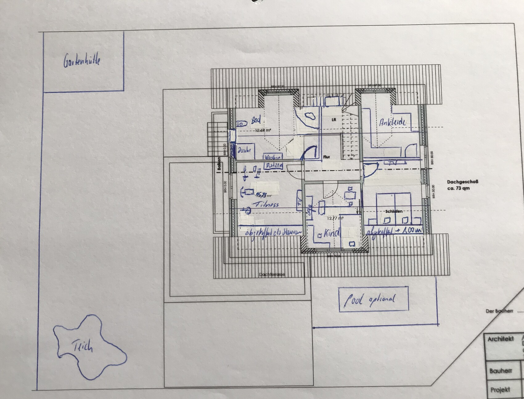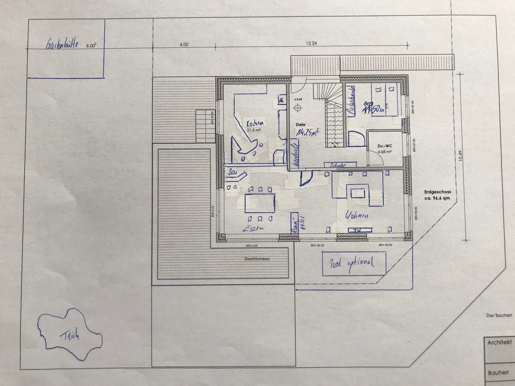 Da wären dann nach Abzug von Garage und Haus nur noch 87,60 m2 für Terrassen, Wege, Gartenhütte, Hof/Auffahrt … das wird schon eng.Alter guckst Du - Gott will es. Zufällig 86m² der ganze Frums. Ok, kleiner Scherz. Architektenempfehlung klingt immer schon mal vielversprechend. Ich hoffe, wir dürfen wieder schauen.