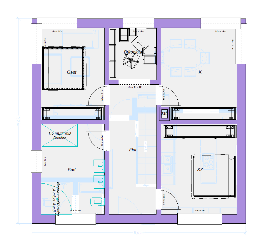 Was mir nicht so gut gefällt ist der im Vergleich zum anderen Entwurf sehr große Flur im OG. Eine gerade Treppe lässt halt nicht viele Möglichkeiten.