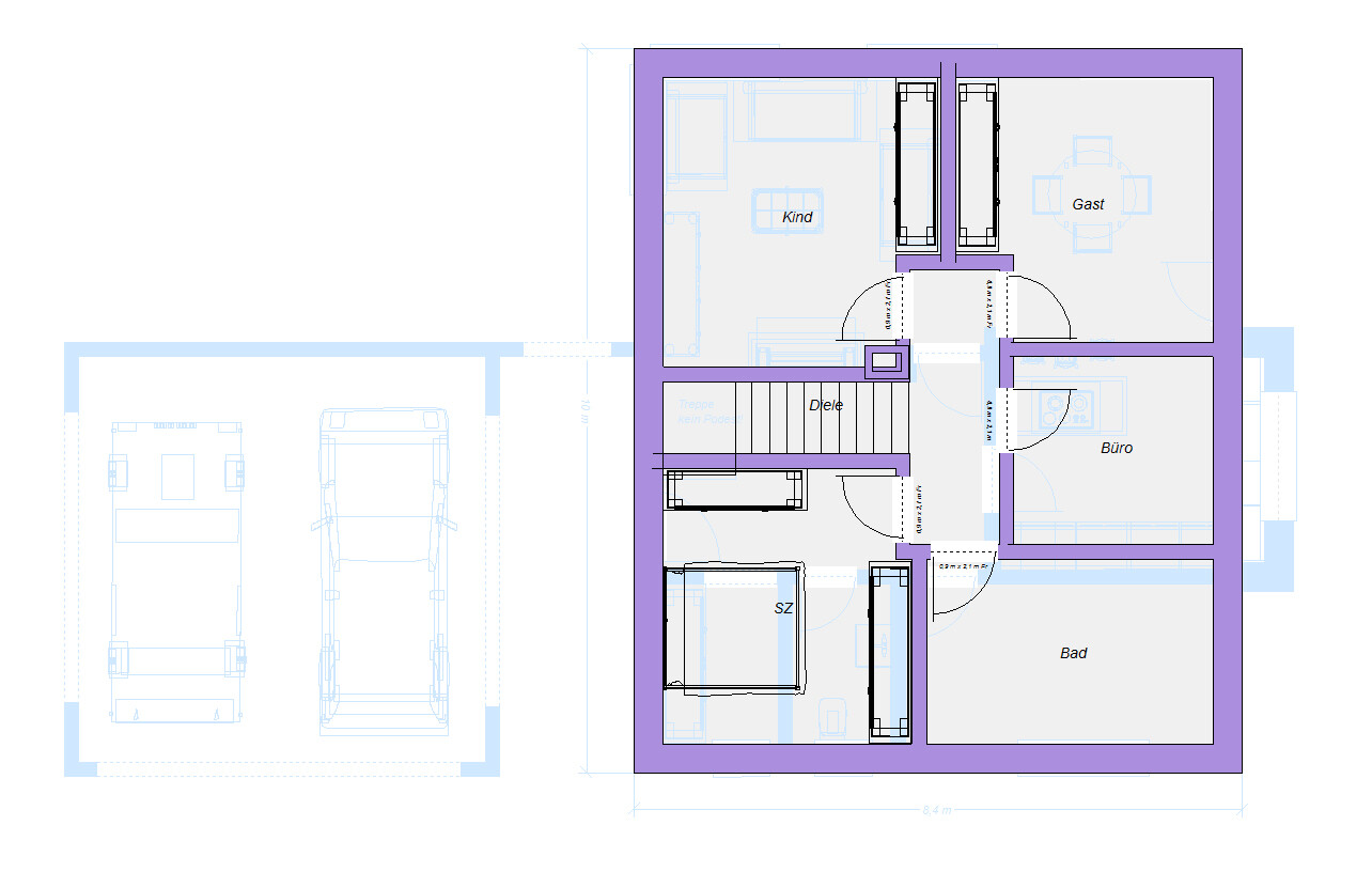 OG: Separates Gästezimmer, dafür Schlafzimmer etwas kleiner und Kinderzimmer auchDer Entwurf sieht interessant aus, vielen Dank. Folgende Punkte fallen mir zum Entwurf ein: