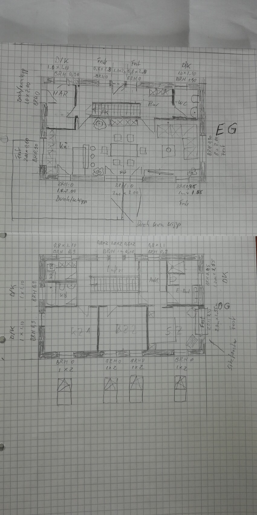 Handgezeichneter zweigeschossiger Grundriss eines Hauses auf kariertem Papier, zwei Etagen.