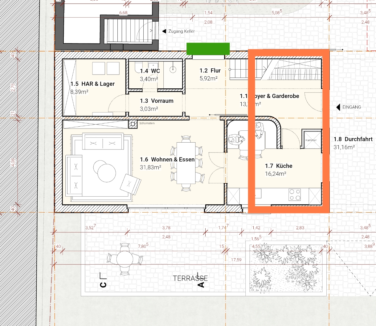 Ich versuche nochmal kürzer zusammenzufassen, was ich geschrieben hatte. Ich muss das zitieren mal weglassen, denn es ist auf dem Smartphone unheimlich anstrengend zu nutzen. Vielleicht stelle ich mich auch zu doof an.Mir geht es genauso. Längere Beiträge schreibe ich auch nur, wenn ich am Laptop bin. Sonst husche ich als Geist hier herum, verteile "Daumen hoch" und schreibe maximal Dreizeiler.Das Haus wird auf eine Stelle gebaut, wo aktuell noch ein paar Schuppen und ein großer Gartendurchgang stehen. Der neue Durchgang wird auch ein Gartendurchgang. Es wird also niemals ein Auto durchfahren, sondern maximal einparken.Das ist schon mal eine ganz wichtige Info, weil es die Situation um die Eingangstür erheblich entschärft!Müsste man bloß sehen, dass es nicht zu dunkel wird im nördlichen Teil der Küche.Nordfenster bringen diffuses Licht. Insbesondere Abends ist das recht angenehm. Gegen Mittag hat man jedoch den vollen Schatten vom Haus.Soweit ich den Grundriss nun verstehe (orangener Kasten = Küche), ist diese jetzt extrem groß geworden. Quasi das Gegenteil von vorher. Wenn da aber noch weiter eine Sitzecke drin Platz findet, dann passt das sehr gut.