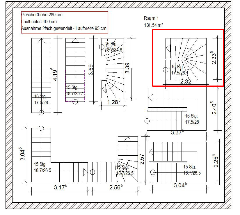 Ich denke, deine Steigungen und Auftritte passen. Ich weiß nur nicht, ob die Verteilung der Treppenläufe so gut ist. Siehe im Vergleich für Geschosshöhe 280 cm mit einer Stufe weniger das rot markierte. Und dazu im Vergleich aus deiner Treppe, wo ich den roten Bereich kritisch sehe. 5 bis 6 Stufen, die da in der Mitte im Auge spitz zusammenlaufen. Durch die ungleiche Verteilung der Schenkel. Ich bin halt auch kein Treppenbauer.