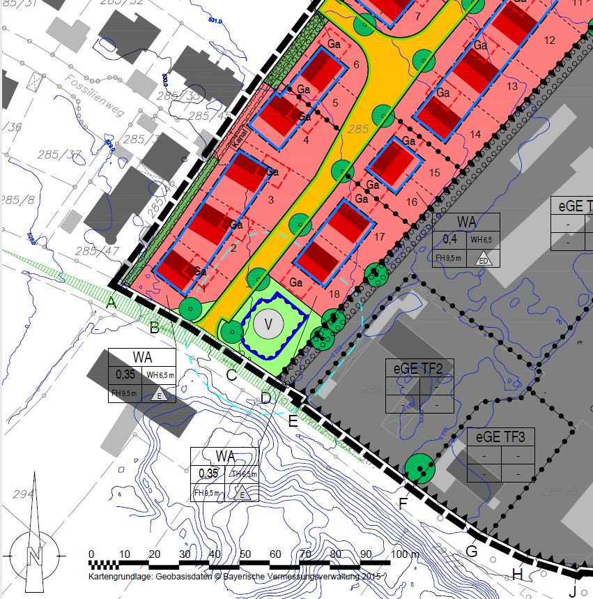 Maximale Höhen/Begrenzungen Wandhöhe: 6,5 m, Firsthöhe: 9,5 m., Garagen Firsthöhe: 3 m