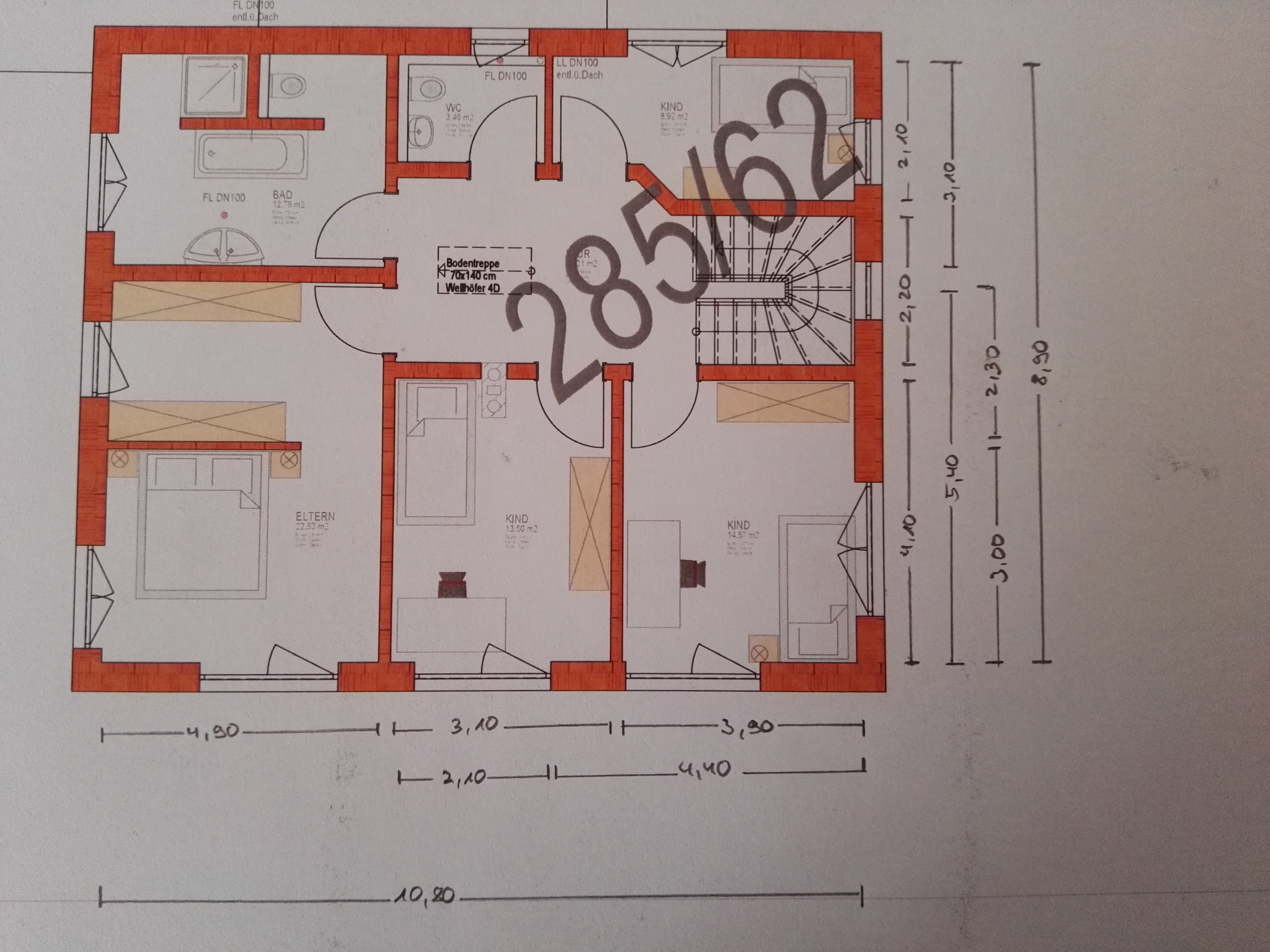 Elternschlafbereich im OG finde ich auch ungünstig, der links schlafende Partner hat einen schmalen Mäusegang neben dem Bett, der rechts schlafende den offenen Bereich Richtung "Schrank", wo vermutl. noch nicht mal ein Nachtkästchen richtig gut passt.