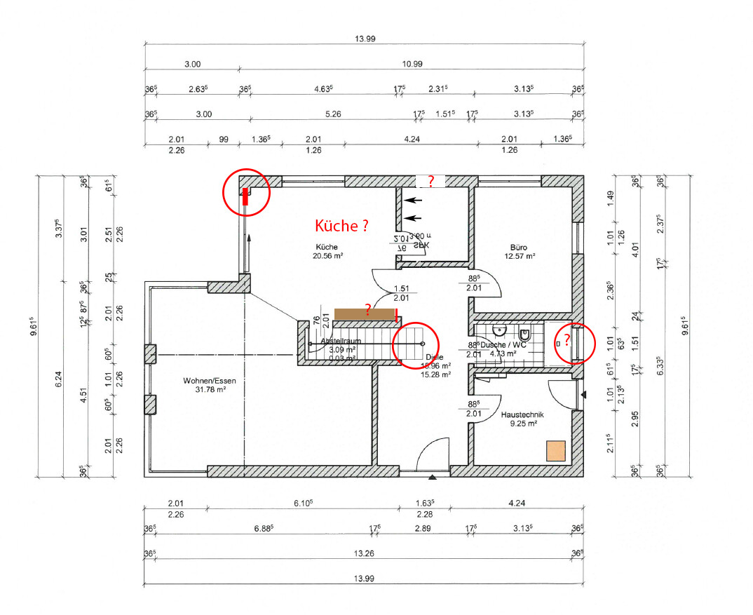 2. Obwohl die Küche groß ist, bietet sie kaum Stellfläche. Habt Ihr da schon einen Plan? Wäre es eventuell sinnvoll, auf die Doppeltür zu verzichten oder 1 große und 1 Kleine Tür zu planen, um noch Stellfläche für Regale an der Treppenwand zu haben? Ich würde die Schiebetür nach außen verkleinern, so dass die Stellfläche für eine Küchenzeile durchgehend bis zur Westwand möglich ist.