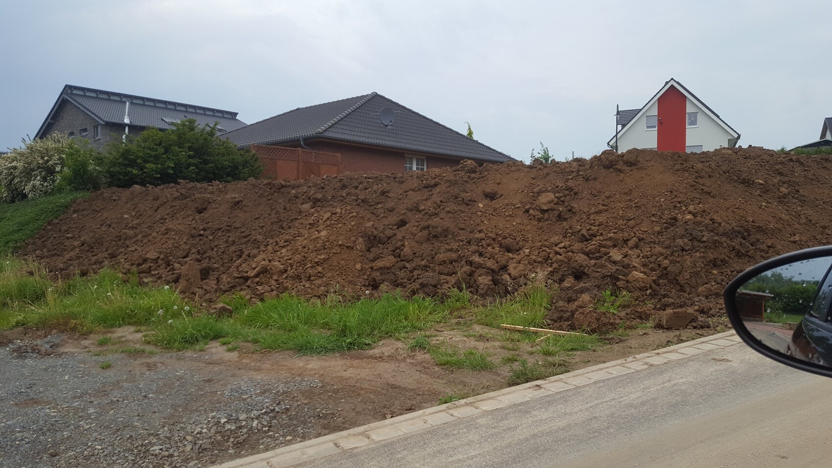 Plant eure Außenanlage, so dass möglichst wenig Erdarbeiten notwendig sind. Jeder Kubik kostet und das Abfangen auch.