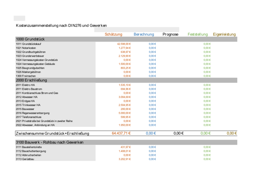 Kostenzusammenstellung nach DIN276 mit Grundstück, Erschließung und Rohbau in Tabelle